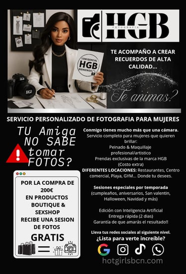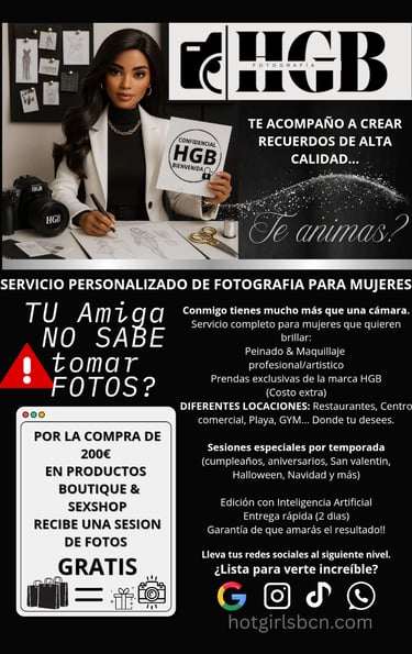 Además, como creadora de contenido digital, combinamos conocimientos avanzados en inteligencia artificial para ofrecer un toque innovador y exclusivo a tus fotos. Trabajamos en la ciudad de Barcelona, enfocándonos en sesiones fotográficas para mujeres en cualquier ocasión.